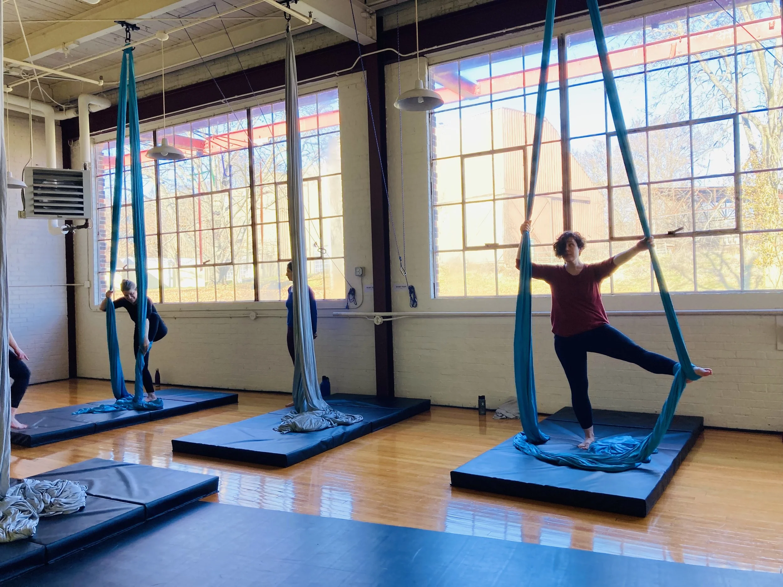 If you’re new to aerial, start with Beginner Fabric or Beginner Sling.
