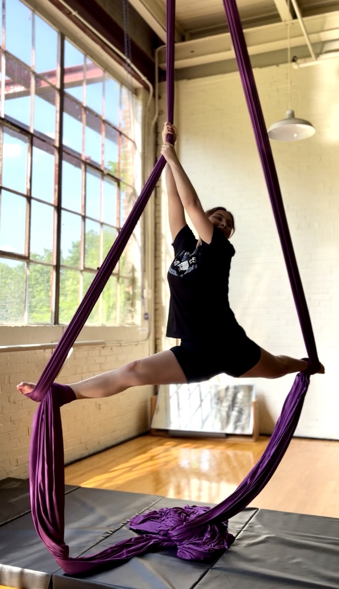 Aerial fabric is physically demanding but adaptable. Our instructors provide progressions and modifications, and students are encouraged to work within their own abilities while building strength, coordination, and confidence over time.